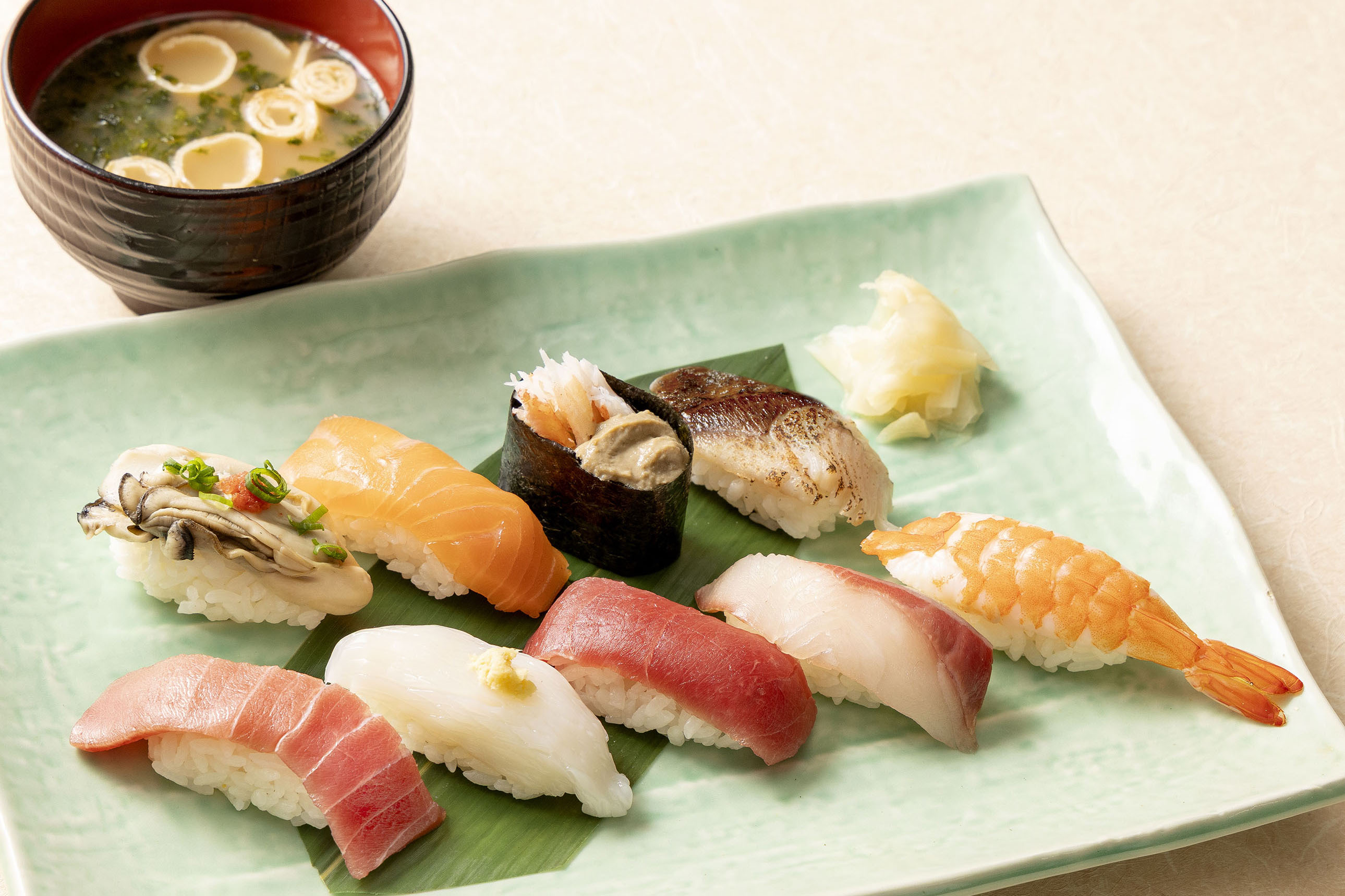 Medium Fatty Tuna / Yellowtail / Broiled Herring / Spear Squid / Boiled Shrimp / Steamed Oyster / Atlantic Salmon / Crab Meat & Crab Butter Gunkan Roll / Chawanmushi (Savory Egg Custard) / Small dish / Dessert / Miso Soup