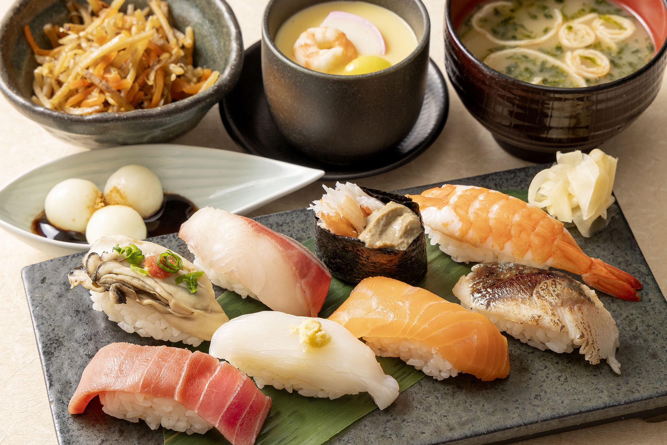 Medium Fatty Tuna / Yellowtail / Broiled Herring / Spear Squid / Boiled Shrimp / Steamed Oyster / Atlantic Salmon / Crab Meat & Crab Butter Gunkan Roll / Chawanmushi (Savory Egg Custard) / Small dish / Dessert / Miso Soup